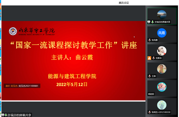 为建设适应新时代要求的一流本科课程,全面开展一流本科课程建设,树立课程建设新理念,推进课程改革创新,实施科学课程评价,严格课程管理,夯实基层教学组织建设,提高教师教学能力,形成多类型、多样化的教学内容与课程体系,yl9193永利集团于5月12日邀请山东建筑大学国家级一流课程负责人曲云霞教授,利用腾讯会议以线上形式举办了题为《国家一流课程探讨》的课程建设讲座。yl9193永利集团全体任课教师等参加了本次讲座,讲座由办公室主任车建成主持。
