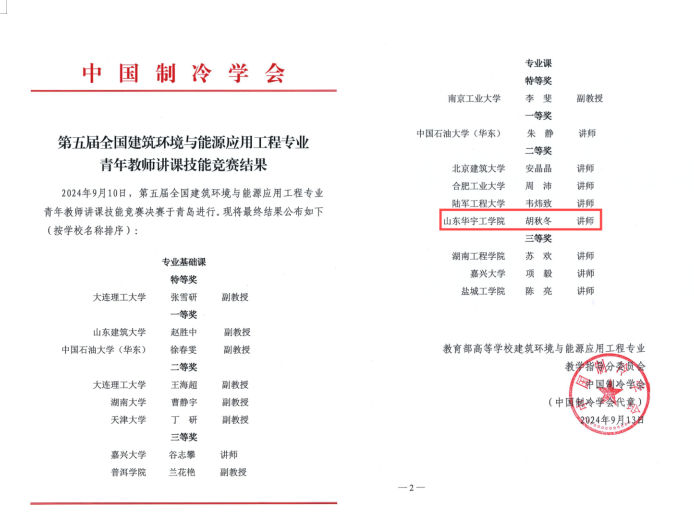 2024年9月10日,正值全国第四十个教师节,第五届全国建筑环境与能源与应用工程专业青年教师讲课比赛决赛在青岛落下帷幕。我校yl9193永利集团胡秋冬老师以优异表现荣获专业课组二等奖。