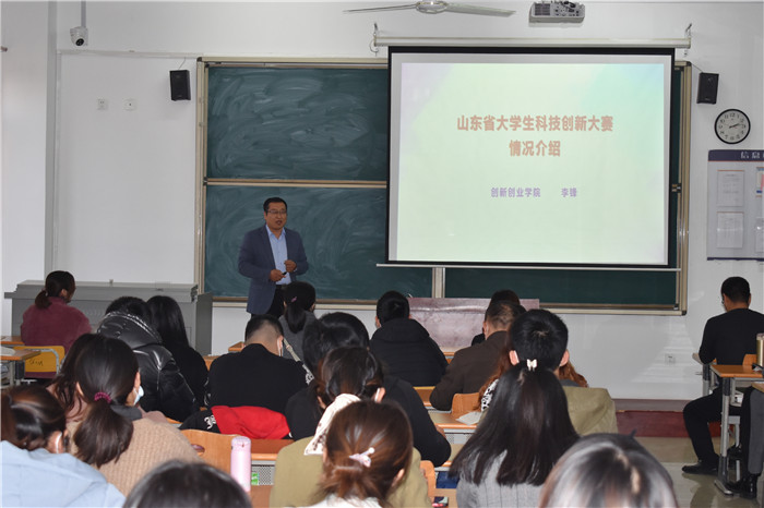 为深入学习贯彻习近平新时代中国特色社会主义思想,落实省委、省政府关于实施创新驱动发展战略、促进新旧动能转换、深化高等学校创新创业教育改革的决策部署,展示大学生科技创新成果,鼓励支持大学生开展科技创新活动,11月11日,我院特邀创新创业学院李锋院长为全院教师做了“第七届山东省大学生科技创新大赛”的专题讲座。学院院长助理相培、刘占凯,全体教师及辅导员参加了本次讲座,讲座由院长助理刘占凯主持。