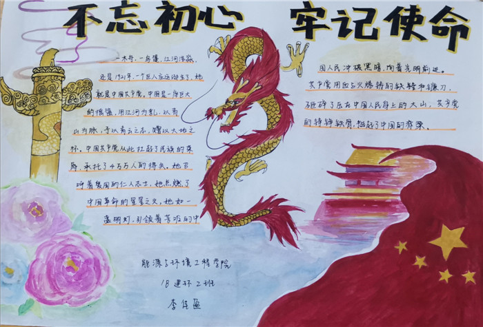 神州奋起,国家繁荣;山河壮丽,岁月峥嵘!为深入学习宣传贯彻习近平总书记关于“不忘初心、牢记使命”主题教育的重要讲话精神,10月17日至10月28日,能源学院举办了“不忘初心、牢记使命”为主题的手抄报活动。