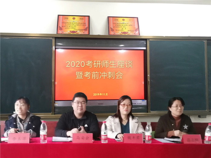 为进一步加强同学们对研究生入学考试的认识,端正考研态度,增强考研学子斗志,坚定正确的奋斗方向。能源与环境工程学院于11月13日下午在21#601教室召开2020年研究生入学考试师生见面交流会。学院院长魏丰君、院长助理马安会、考研专业课指导老师温志梅、李玉苹出席本次交流会。