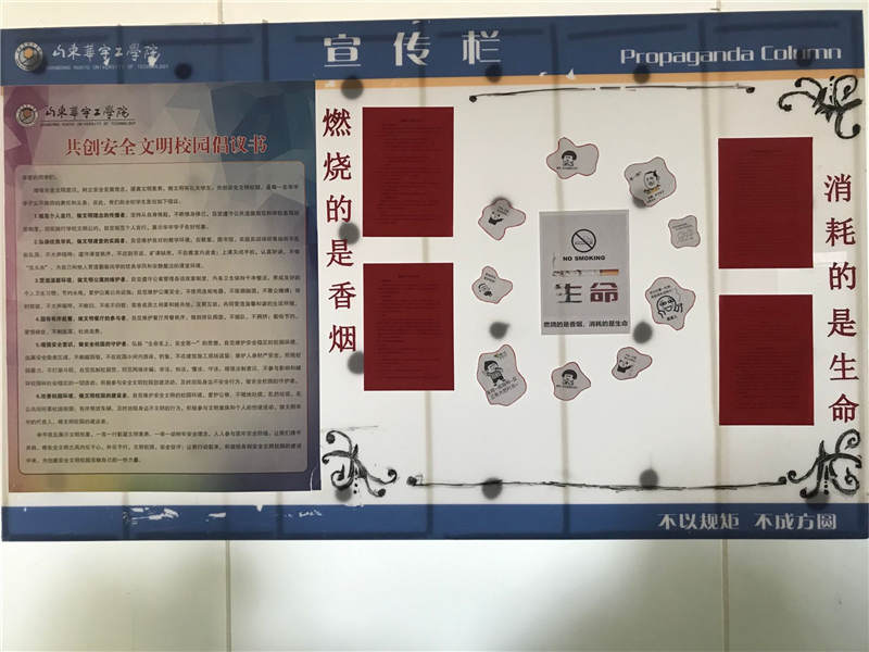 首先,各班级辅导员老师组织班级学生观看禁烟宣传片,向同学们讲解吸烟的性质、危害,并用实际案例教育同学们如何树立正确的人生观、价值观。在班会结束后,每名同学签订《禁烟承诺书》,并张贴于班级信息栏。其次,我院制作了以“燃烧的是香烟,危害的是生命”为主题的禁烟宣传栏,通俗明了的展示学院禁烟宣传的主题。与此同时,我院制定的禁烟制度将在全院范围内执行,相关负责人对教学区域进行不定时巡查,一经发现吸烟者,将会按照禁烟制度进行严肃处理。