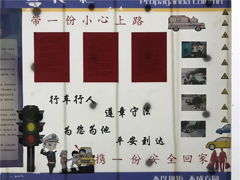 本次宣传栏以文章图片标语的形式向同学们讲述了交通安全事故产生的原因、近期交通事故的案例和安全出行时应该注意的事项等一系列安全知识,并认识到在日常出行中防患于未然的重要性和生命的脆弱和可贵,及时的为同学们敲醒交通安全的警钟。