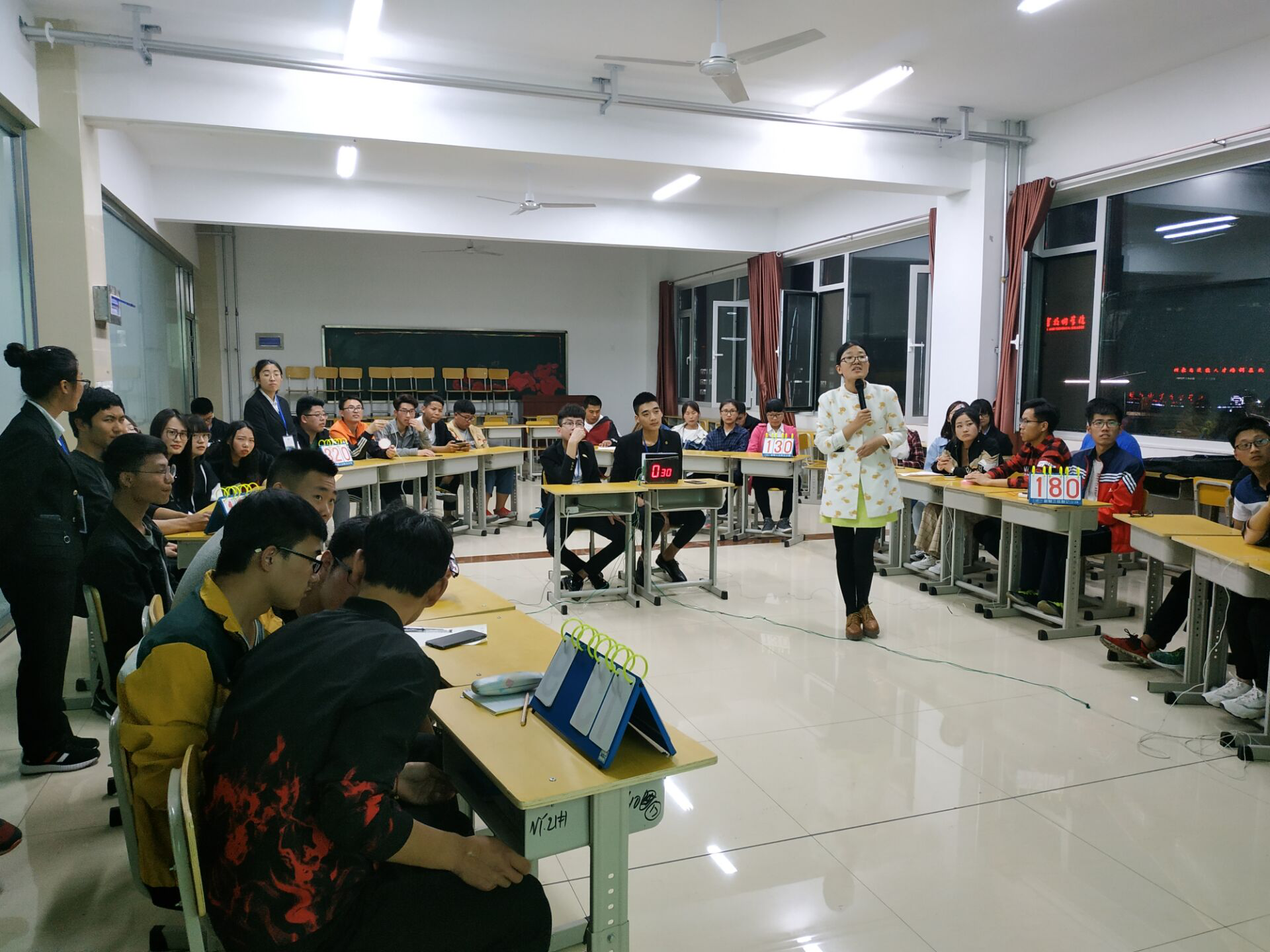 本次大赛采取的是通过初赛笔试选拔,优胜者晋级决赛的比赛模式,由王承志与张建芳两位老师担任主持,纪检部同学负责监察和计分工作。比赛举行当天,制冷教研室主任相培老师亲自到竞赛现场进行赛前动员讲话,调动了参赛选手的情绪,每组参赛选手都是意气风发、斗志昂扬的高喊出自己的参赛口号。随着相培老师讲话的结束此次大赛正式拉开帷幕。