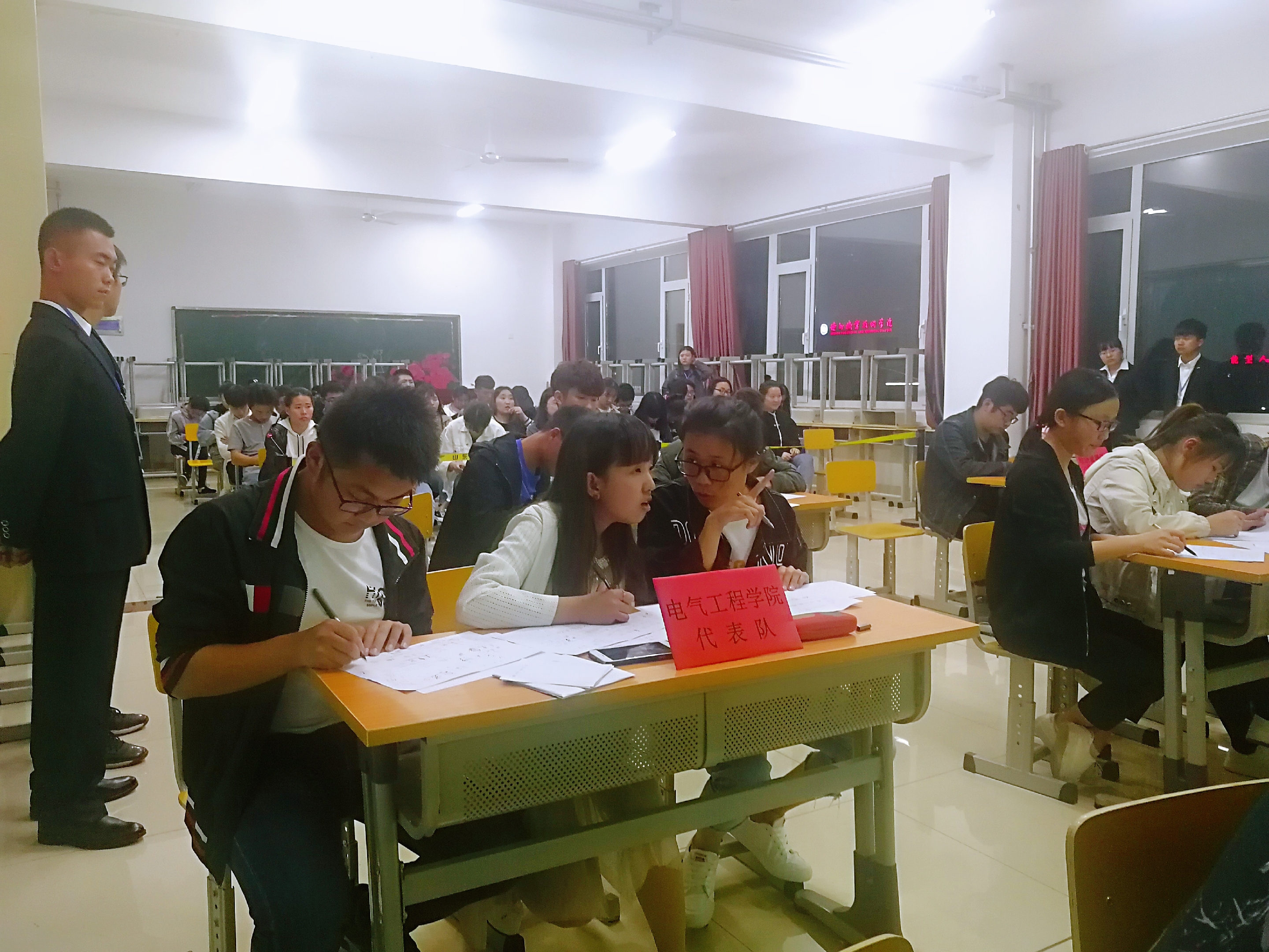 第一环节答题刚刚开始,各代表队均已迅速进入了状态,聚精会神的思考,悄声讨论。在比赛过程中选手们完美的展现出了大学生敏锐的思维、快捷的反应,在短时间内快速做出答案。其中,第二环节采取抢答的形式,各学院的代表队们都积极踊跃的参与其中,比赛现场热烈,各代表队以快捷的反应力竞相作答,同时也带动了现场观众的积极性,自发参与到审题推理中。最后的“故事推理”环节,选手们以敏锐的思考分析、迅速地掌握问题的核心,在短时间内作出了合理正确的推断。三轮比赛顺利结束,能源与环境工程学院以总分31分,建筑工程学院总分29分,电气工程学院总分27分,分获得总成绩一、二、三名。