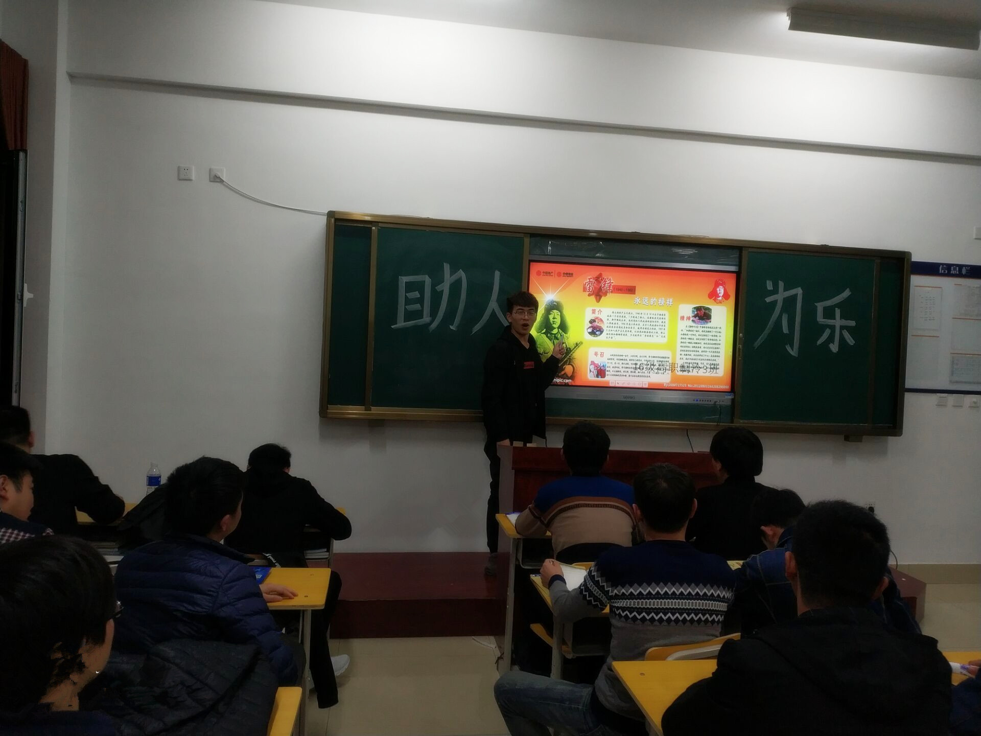 我院各个班级团支书在接到通知后,积极准备,搜集相关素材,制作PPT。班会过程中,团支书向同学们简要介绍雷锋同志一生的事迹,号召同学们在生活中、学习中通过点滴小事来践行“雷锋精神”。同学们积极踊跃发言,阐述自己对“雷锋精神”的认识和理解,以及如何在日常生活中践行“雷锋精神”从而成为一名合格的新时代大学生。同学们通过举手发言、上台演讲等形式,使现场气氛活跃,达到了良好的班会效果。