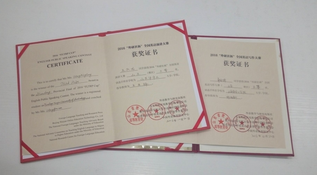 在2016年“外研社杯”全国英语写作大赛中,2014级建筑环境与能源应用工程三班单宝琦和二班任梦莹两名同学分别获得全国三等奖和优胜奖。在全国英语演讲大赛中,王兴龙同学凭借其扎实的英语功底,流利的口语和声色并茂的朗诵获得了全国三等奖的优秀成绩。