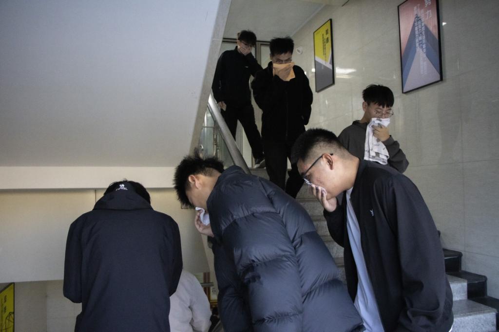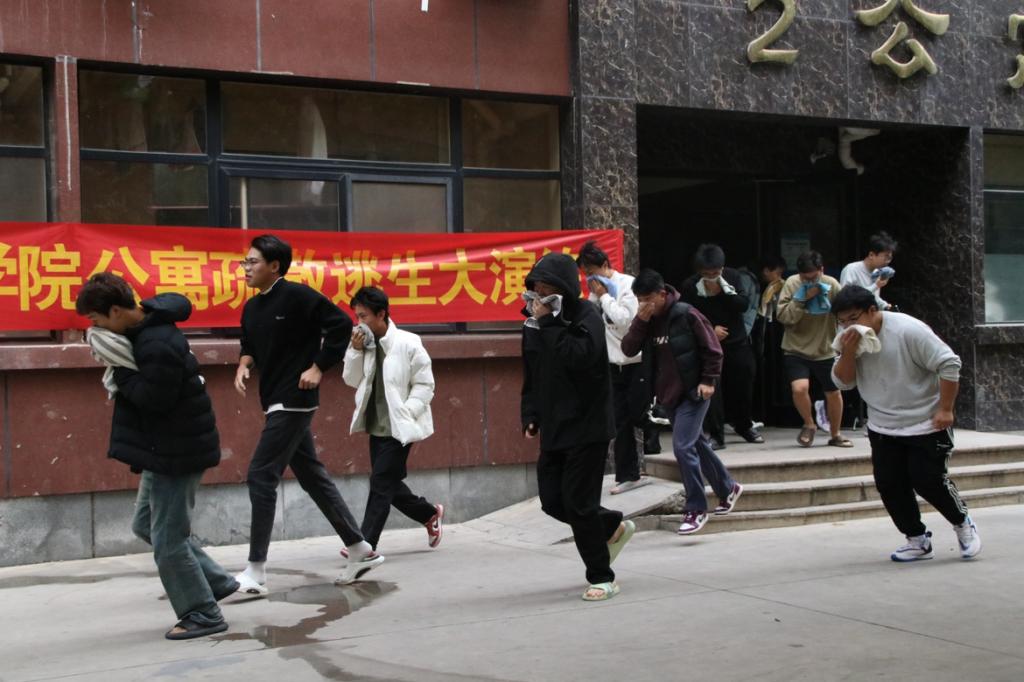 演练期间,学院在各楼层楼梯口设有2名引导人员,引导学生有序安全撤离,在听到逃生口令后,引导员立即组织学生有序疏散。演练过程中,学生弯腰匍匐,用湿毛巾捂住口鼻,有序下楼,听从现场引导人员安排。逃生结束后,学生们在指定地点集合,由负责老师对逃生学生逐一点名,并向现场逃生演练总指挥汇报疏散情况。此次活动观摩学生在指定区域有序观看,辅导员维持现场观看秩序。