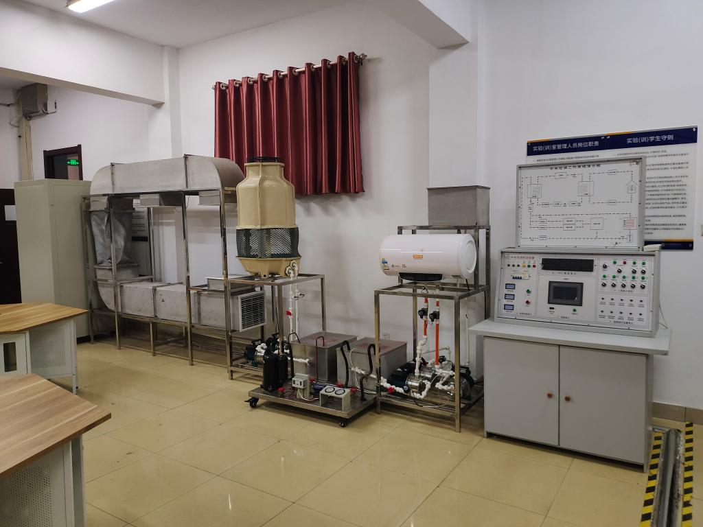 中央空调系统测试实验室主要配备有3套中央空调系统实训装置,服务于《暖通空调系统调试与运行》《建筑环境测试技术》《认识实习》《生产实习》等课程。可完成中央空调系统的运行调试、参数设置调试、参数检测采集、模拟故障排除、网络远程控制等项目,并可以进行PLC、传感器及变送器的安装和使用及其中央空调工程设计。主要培养学生对中央空调系统运行、调试以及对系统进行二次开发和设计等方面的专业能力,为学生从事中央空调系统相关工作打下良好的基础。