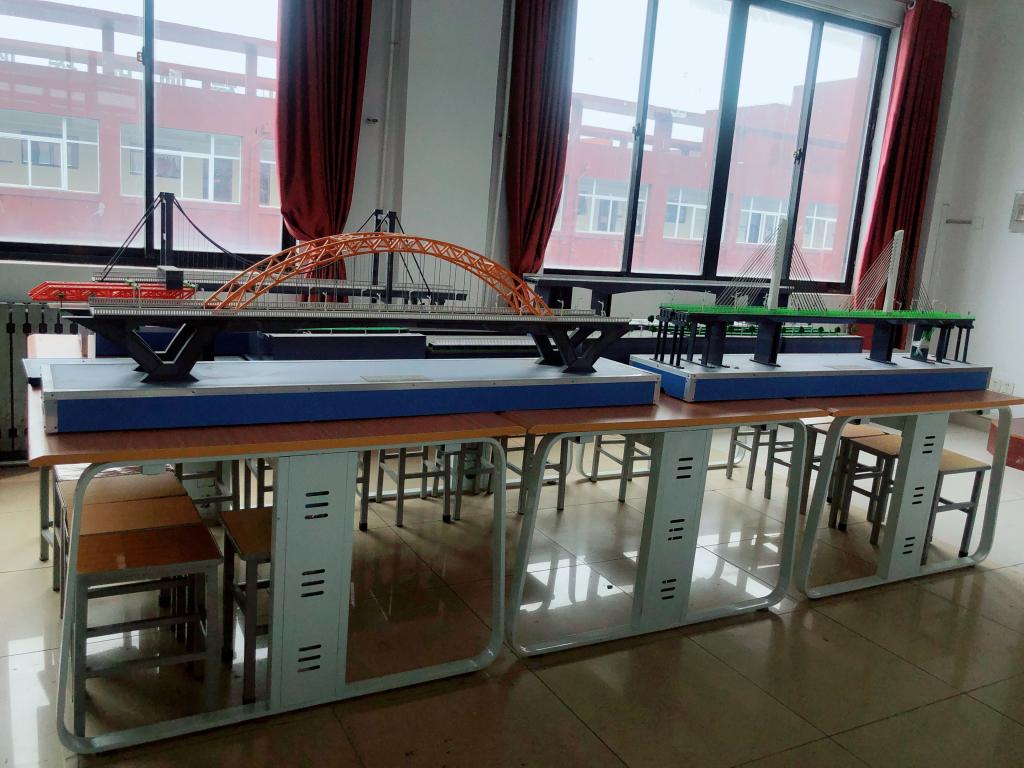 道桥结构实训室配备了整体框架柱配筋构造、整体现浇板配筋构造和剪力墙配筋构造、构造边缘柱配筋构造等构件的钢筋骨架模型,梁桥、拱桥、斜拉桥、城市道路横断面、桥面构造等多种模型。通过对道路、桥梁结构模型参观认识,能够对道路、桥梁结构的基本构造有初步了解,使学生更直观认识道路、桥梁结构;建筑结构模型将实际工程施工图纸内容依据最新平法以立体形式展出,极大的弥补了平法施工图纸在空间表现上的不足,开拓学生思维,巩固《桥梁工程》《路基路面工程》《建筑结构》《混凝土结构识图》课程内容,有助于培养学生对结构施工图的识读和学习钢筋工程量的计算能力,也为学生参加桥梁结构设计大赛、结构设计大赛提供思路。