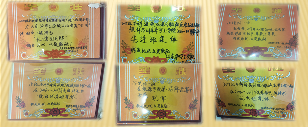 以年华作笔,以汗水为墨,从一张又一张白纸上挥洒出万千光彩,他们是在阳光下闪耀的班级——2015级建筑环境与能源应用工程一班。2015级建筑环境与能源应用工程1班共有29人。班级氛围和谐融洽、相亲相爱,不断进取,朝气蓬勃。其班级辅导员宋成立老师,硕士研究生在读,具有丰富的管理经验,工作期间连续三年被评为“校级先进工作者”。其班级导师相培老师——硕士研究生在读,工作经历丰富,知识渊博,多次获得省市级奖项。15建环一班所有同学积极参加各种文体活动,成绩斐然。全体成员达到《国家体育锻炼标准》。集体荣誉感强,努力为班级增光添彩,获奖比例高。连续三年蝉联“优秀班集体”“先进班集体”“红旗团支部”称号。两次团体冠军: 辩论赛冠军、第二届心理情景剧大赛冠军。在2016-2017年度考核中,被评为院“优秀班集体”和“冠军优秀班集体”。在党建方面,班级中有6人已通过党课考试,成为入党积极分子,占班级总人数的23%,其中1人已发展为预备党员。15建环一班有着和谐强大的班委团队,有着来自五湖四海的同学们,有着班级主题教育等思想建设,有着与时俱进的班风学风,有着学生会社团干部比例高、入党积极分子全院最高的学生,有着具备各项技能跟特长的人才。在过去一年多来,该班级取得多种成绩和荣誉,这既归功于班集体的共同努力,也归功于学院各级领导的关心爱护和精心培育。不忘初心,方得始终。2015级建环1班将继续把勤奋学习作为人生进步的重要阶梯,把奉献社会作为不懈追求的优良品德。