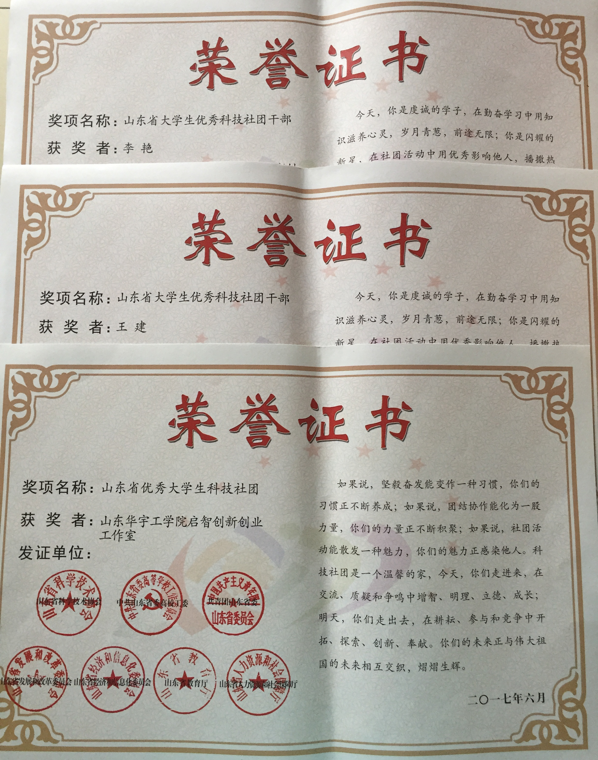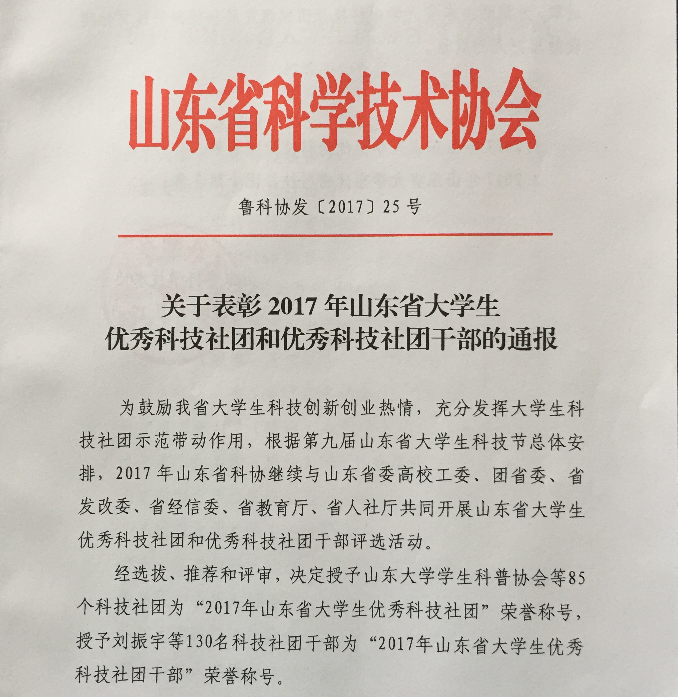 近日,山东省科学技术协会下发了《关于表彰2017年山东省大学生优秀科技社团和优秀科技社团干部的通报》(鲁科协发[2017]25号),我院李艳同学荣获2017年山东省大学生优秀科技社团干部。
