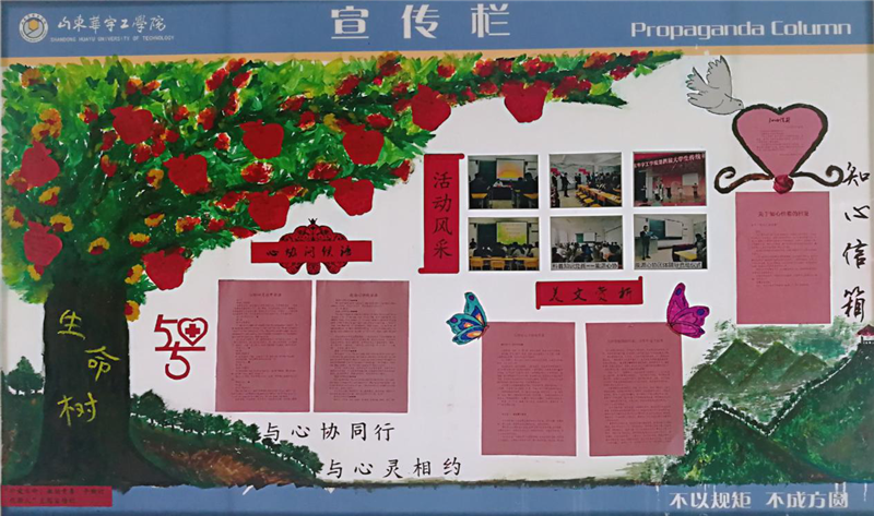 本期心理宣传栏的制作围绕“珍爱生命,激扬青春,争做时代新人”为主题,共分5个版块。其中,画面中的“生命树”——苹果树,作为宣传栏的亮点,象征着学院的盎然生机活力,寓意在众位学子的共同努力下,学院取得的丰硕成果与佳绩。
