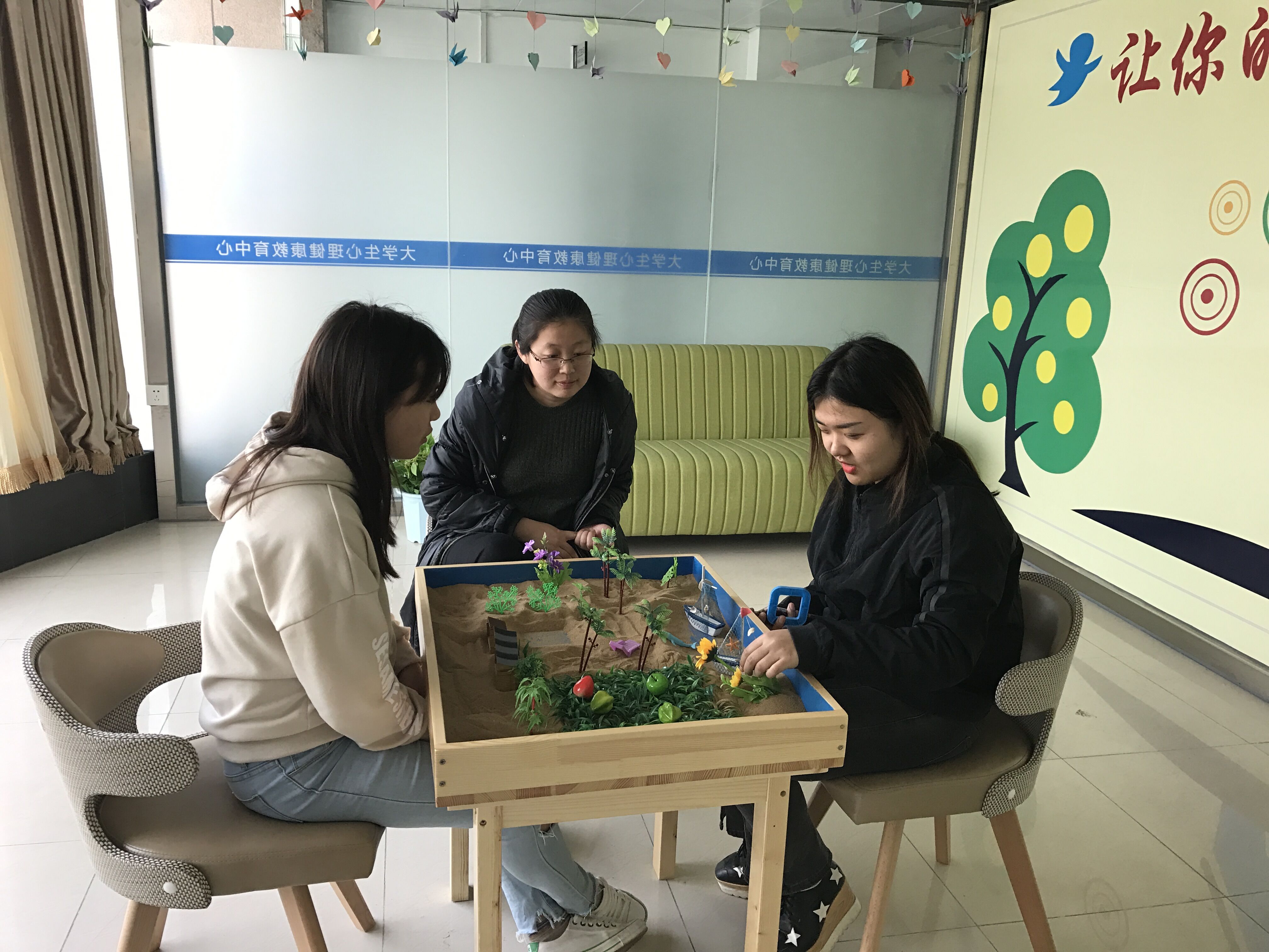 在张旭老师和心协干部的精心组织安排下,心协会员分为四个小组,由会长带队,井然有序的走进大学生心理健康教育中心,会员们的兴奋与好奇早已溢于言表。步入心理健康教育中心,首先映入眼帘的是许愿墙,它由51个纸质心形饰品组成,都是学生手工折叠而成,许愿墙是承载愿望的实体,会员们通过黏贴许愿卡,可以寄托美好愿望,抒发内心情怀。接着在心理健康中心讲解员石雪婷的引领下,我们走进了心理咨询室,这里整体以暖色调为主,有各种小折纸,中间摆放的沙盘是重要的心理辅导工具之一,会员们可以借助沙盘和各种沙具构建自己的心理臆想,开启一段心灵之旅。最后我们来到了涂鸦墙,会员若不想交谈,可以把他想要表达的内容以画画的形式呈现出来,通过画画的过程了解学生心理的变化及想法。涂鸦墙用绿色的树枝加以衬托,象征着新的未来,会员们对未来的美好希望之情亦是油然而生。