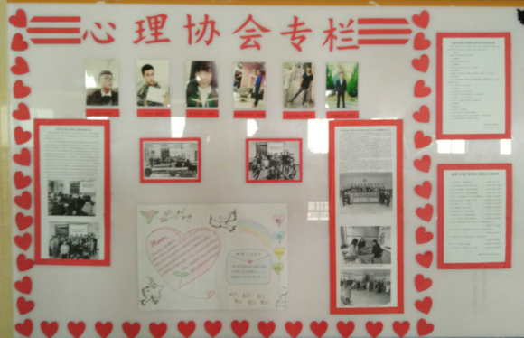 宣传栏以图文并茂的方式回顾了心协在一个月内举办的活动和召开的会议。会员们运用自己所学精心制作心形剪纸装饰宣传栏四周,宣传栏上方张贴了心协干部照片,用大幅板面介绍了第一次参观校大学生心理健康教育中心及心协第一次表彰大会等,在宣传栏右侧张贴了心协标语征集启事和评选出的优秀标语。