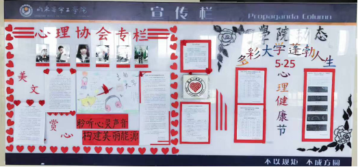 5月4日,能源与环境工程学院心理协会便开始了“多彩大学 蓬勃人生”为主题的宣传栏筹备工作,由实践部长杨豪东主要负责,在心理协会全体成员的共同努力下,对宣传栏的色彩、排版、文字和图案等多个方面进行了规划和制作。我们力求主题突出、设计新颖、布局合理、图文并茂、书写工整,我们力求美丽与内涵同在、速度与质量兼得。宣传栏整体分为两大板面,左边为心理协会专栏,会员们运用自己所学精心制作心形剪纸装饰宣传栏四周,宣传栏上方张贴了会长和各部长的照片,位于中心的是本次活动的主题海报,其上点缀几只纸鹤,不乏生机与活力。其左侧是挑选出的学生来稿美文,其正下方用红纸醒目地张贴了我院心协的标语:“聆听心灵声音,构建美丽能源”。整个宣传栏中间位置为我们学院特色的知心信箱,也张贴了对来信者的悉心解答。右边为学院动态,紧跟这次主题活动,精心剪出“多彩大学蓬勃人生”和“525心理健康节”几个彩色字,并张贴了为响应学校举办的大学生心理健康节系列活动之我院进行初选的结果。