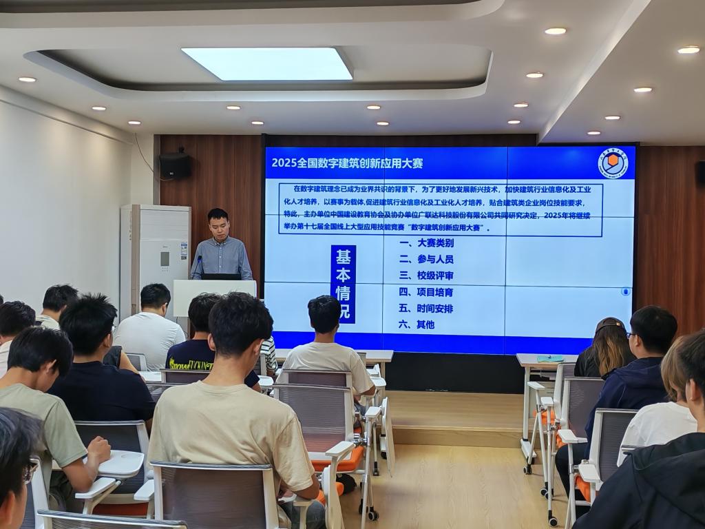 随后,胡同旭老师围绕全国数字建筑创新应用大赛的赛事背景、赛道类别、参赛对象、初赛选拔与时间安排等五个方面展开宣讲。胡老师强调,全国数字建筑创新应用大赛是为了更好地发展新兴技术,加快建筑行业信息化及工业化人才培养,使学生具备更加贴合建筑类企业岗位技能要求而举办的一场赛事。学生通过参加竞赛,能够培养团队合作精神,激发创新思维,提高解决问题能力,促进个人综合素质全面提升。同时,胡同旭老师详细解读了大赛的赛道类别、校内选拔赛组织流程与时间安排,并通过解读学校学科竞赛管理办法使同学们深刻认识到积极参赛的重要性。