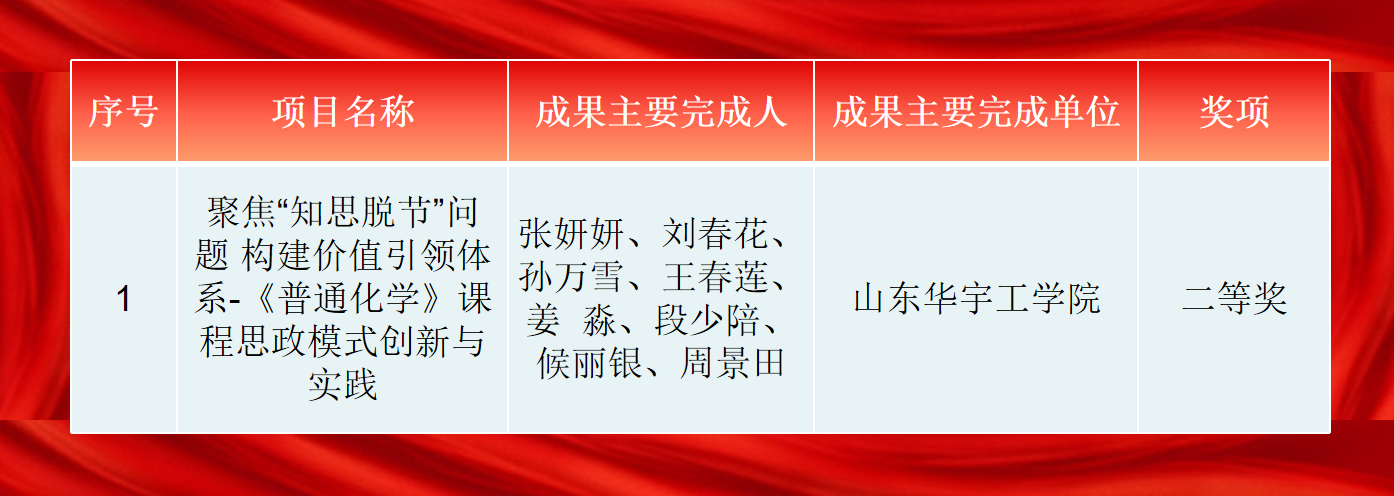 在山东化学化工学会2025年度教学成果奖评选中,由张妍妍老师申报的《聚焦“知思脱节”问题构建价值引领体系--《普通化学》课程思政模式创新与实践》项目,凭借对课程思政建设的深入探索和创新实践,荣获二等奖。